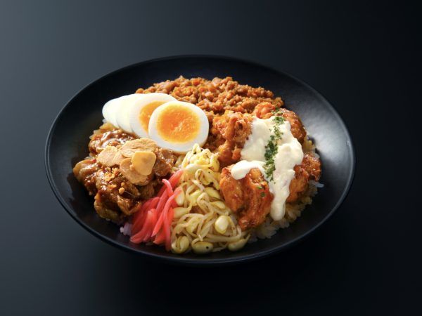鶏と豚が夢の共演!ご飯はなんと300g使用していて、その上に主演級おかずを贅沢にトッピングし、よくばりなお弁当に。甘く味付けしたそぼろに、タルタルソースをかけた鶏から揚げ、にんにくを効かせた醤油ダレで味付けした豚焼肉には、フライドガーリックをのせました。どこを食べても違うおいしさが楽しめる、よくばりな一品。