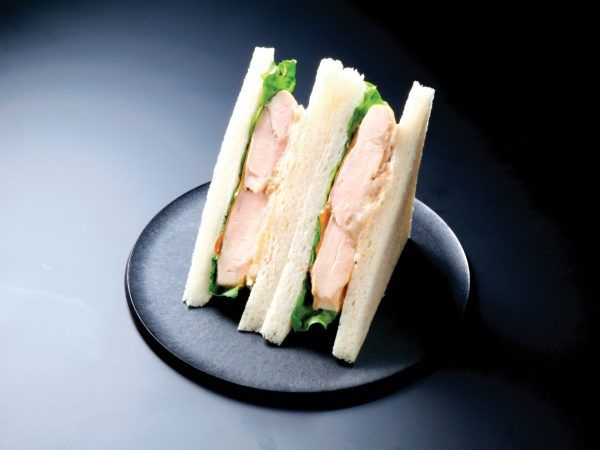 見た目以上に背徳感を味わえるサンドイッチ。中には、にんにく醤油に漬け込んで焼いた鶏もも肉と一緒に、オニオン・ガーリック・ペッパーが効いたマヨソース入りポテトサラダと、ガーリックバターソースをあわせてサンドしています。