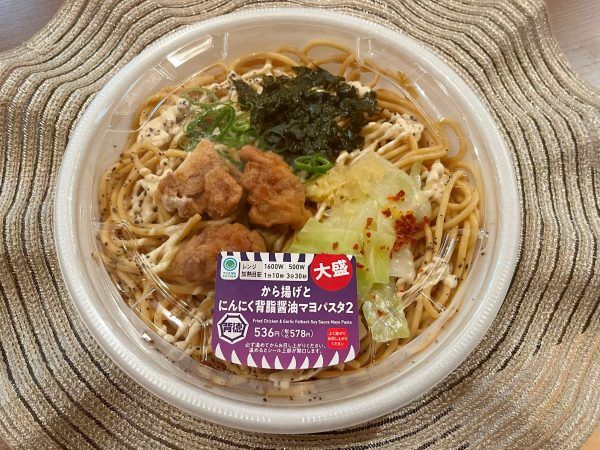 昨年9月に発売し「背徳感」あるパスタとして話題となった商品が、パワーアップして戻ってきました!にんにくを効かせ、背脂を加えた醤油仕立ての大盛パスタです。さらに鶏のから揚げ、刻みにんにく、マヨソース、キャベツ、海苔、青ねぎなどをトッピングして背徳感がかなりアップしています。