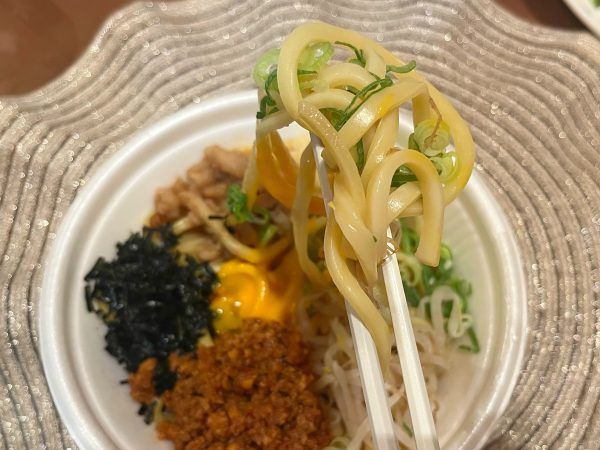 中太の中華麺に、醤油ベースのピリ辛専用ダレが絡んで、味は濃いめで、食べ応え抜群!麺がなくなったら、さらにご飯を足してもおいしかった~!