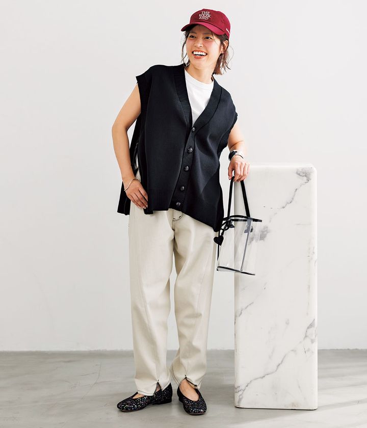 ベスト¥34,100(スタンブリー/ヒューエルミュージアム)Tシャツ¥18,700(エイトン/エイトン青山)パンツ¥31,900(クロ/サードマガジン)バッグ¥33,000(ヴァジック/ヴァジックジャパン)キャップ¥9,900(ガリャルダガランテ/ガリャルダガランテ 青山店)シューズ¥66,000(ペリーコ/アマン)ピアス¥9,900〈カラ・ユ〉右腕バングル¥19,800左腕バングル¥108,900〈ニナ・エ・ジュール〉(すべてショールーム ロイト)
