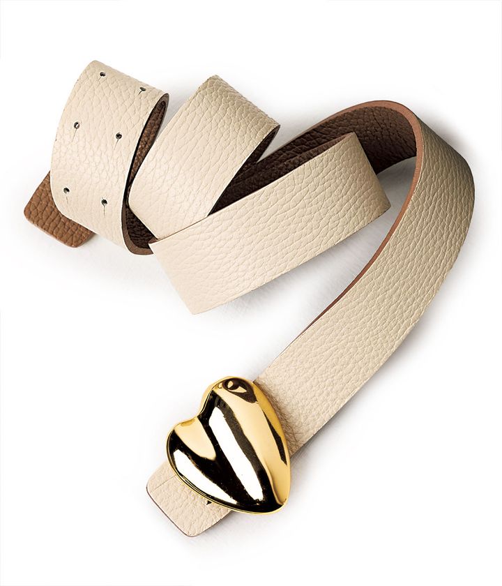 単調になりがちなワンツーコーデにハートモチーフでさりげなく甘さをプラス。ベルト¥24,200(ア ヴァケーション/ノーベルバ)