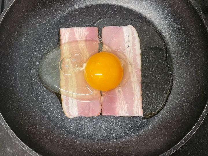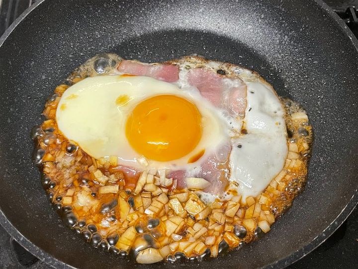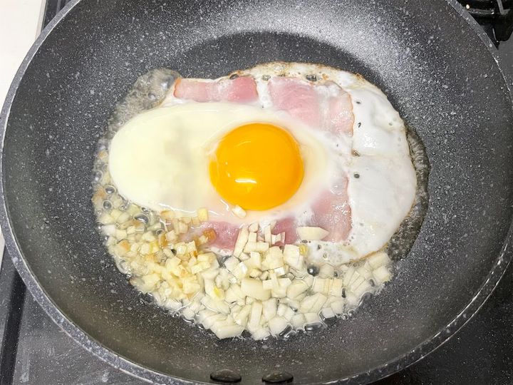 ベーコンはカリッと、卵は半熟になるように焼き上げます。
