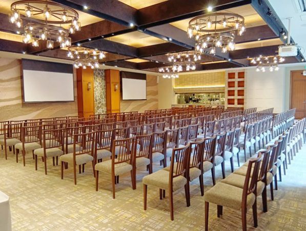まずはチャペルとウエディングやパーティー、研修などに利用できる4つの会場を見学させていただきました。 オープン当時は披露宴会場が2つでしたが、バンケット(宴会や晩餐会)や婚礼の要望が多くなり、今までレストランとして使用していたスペースも、今回のリニューアルにより数々のバンケットに対応できるようになりました。