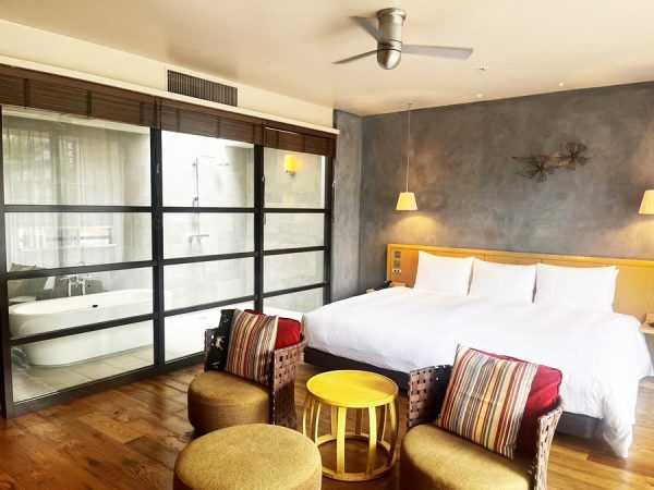 ここの部屋は全面ガラス張りのバスルームと、広すぎるベッド、温かみのある家具が特徴的です。洗面台も2つ付いており、朝の時間も贅沢に過ごせます。