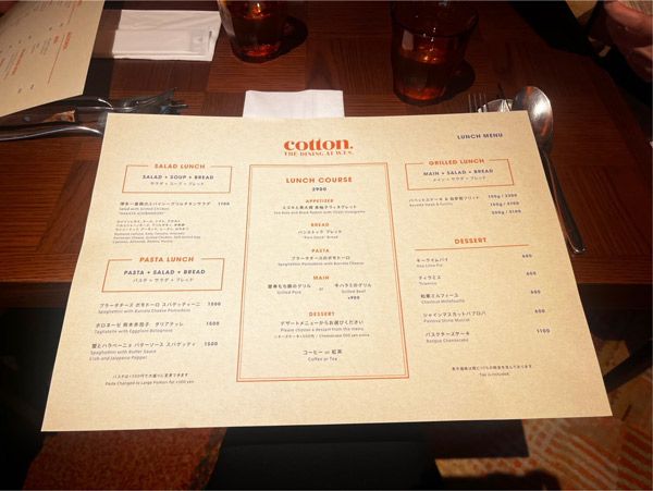 ランチメニューはサラダランチ(サラダ+スープ+ブレッド)、パスタランチ(3種類から選べるパスタ+サラダ+ブレッド)、ステーキのお肉の量を選べるグリルドランチ(メイン+サラダ+ブレッド)、ランチコース(前菜+ブレッド+パスタ+2種類から選べるメイン+デザート+コーヒーor紅茶)の4種類。気分で料理を選べるように用意されています。