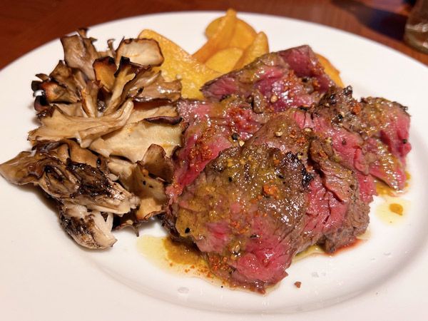 赤身のお肉好きにはたまらない、パンチのあるグリルドランチ。じゅわっとうま味があふれるバベットステーキに、ヘルシーな舞茸とカリカリのポテトの自家製フリットの組み合わせです。程よくレア加減に焼き上げられたお肉は、とっても柔らかくて何枚でも食べられちゃう美味しさでした。