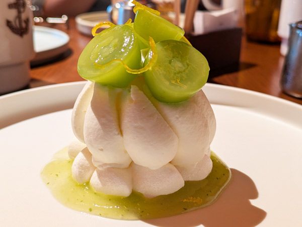 美しいデコレーションと色合いに、テーブルで歓声が上がった“サンシャインマスカットパブロバ”♪ フレッシュなシャインマスカットに、口の中でとろけるメレンゲ、そして中にはシャーベットが入っているので、一皿に色々な楽しみが凝縮されているんです。たくさんの食感も楽しめて見た目よし!味よし!の一点でした!