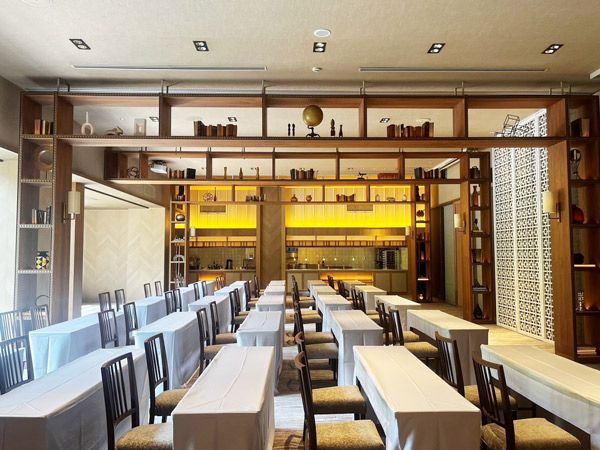 着席で約80名の利用ができ、オープンキッチンと家具が特徴的です。こちらもチャペルと同じようにミットセンチュリー家具の代表作、丸い照明が使われています。プールに面しているため、プール側から差し込む光と静かな水の音も楽しむことができます。また授乳室やお手洗いは各フロアに設置されており、設備面も安心です。