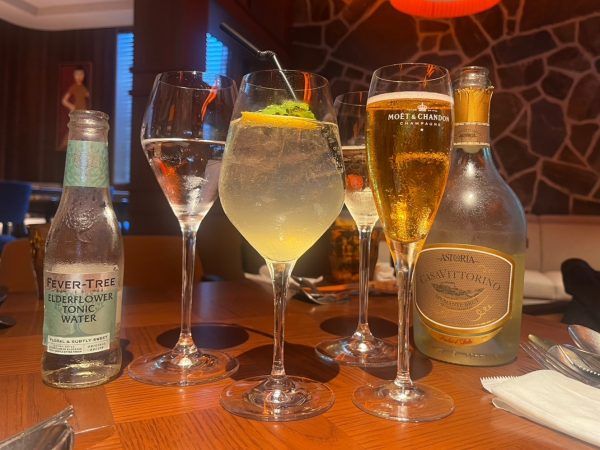 まずドリンクはメニューに載っていた3つのノンアルカクテルアップルジンジャー・エルダーフラワートニック・オーガニックティースパークリングと、ホテルのハウスワインになるカーサ・ヴィットリーノ・プロセッコです。ハウスワインはウイスキーのような珍しい形の瓶。フルーティーなスパークリングで飲みやすいです。