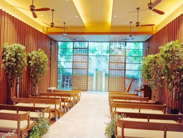 チャペルの扉を開くと正面から差し込む光、ミットセンチュリー家具やオレンジ色の照明から感じられる温かさ、緑の雰囲気も以前より濃くなっており、広とても開放的で大きく深呼吸したくなるような素敵な空間が広がっています。椅子や大理石もリニューアルされ、抜け感のあり丸みのある背もたれと会場の雰囲気に馴染むシート、大理石の色合いも温かみと結婚式の特別感を味わえる素敵な空間を演出しています。