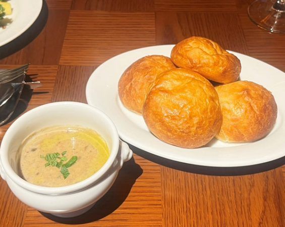 マッシュルームのスープは柔らかく甘みのあるパンと相性が良く、マッシュルームの香りと味がバランスよく広がりました。