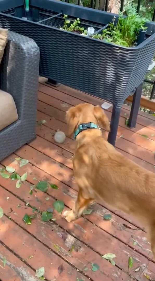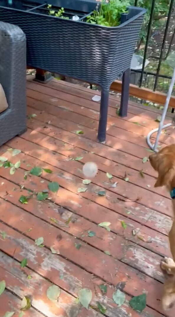 すかさずウッドデッキの外に飛び出していくのでした! どうやら、飼い主さんにボールを投げてもらわなくても、ひとりでボール遊びを楽しむ方法を見つけたみたいですね。