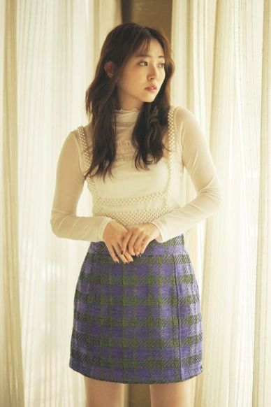 レトロなパープルのスカートが印象的なコーデ。トップスは白のアイテムを選ぶことで、スカートが際立ちます♡ シースルートップスにビスチエをレイヤードして上級者感のある着こなしに。