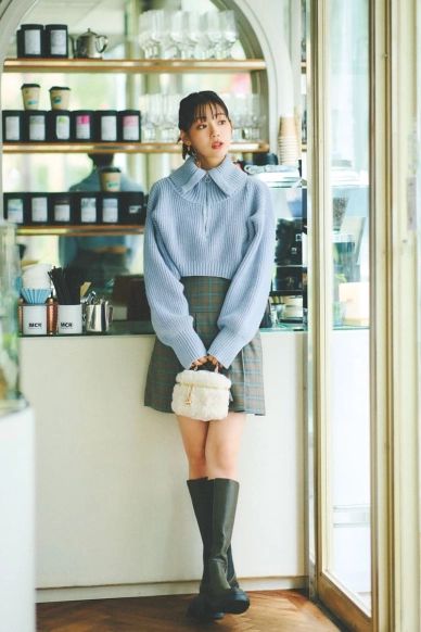 爽やかで上品な色あわせのコーデ。ショート丈のニットでスタイルアップを狙って♡ チェックのミニスカやロングブーツ、もこもこバッグで季節感を意識して!