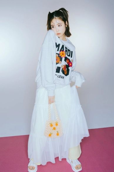 ロゴスエットが主役のコーデ。白のチュールスカートが、やわらかな女のコらしい印象を加えてくれます。小物にビーズバッグを選べば、遊び心のあるコーデに♡