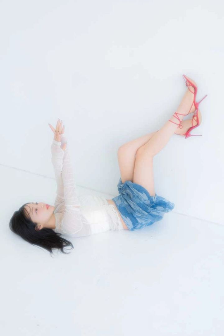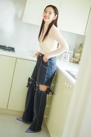 リボンやシアー素材など、ガーリー要素満載なデニムコーデ。太ももがチラリと見えるカットデザインが可愛い♡ パープルのパンプスを差し色にして!