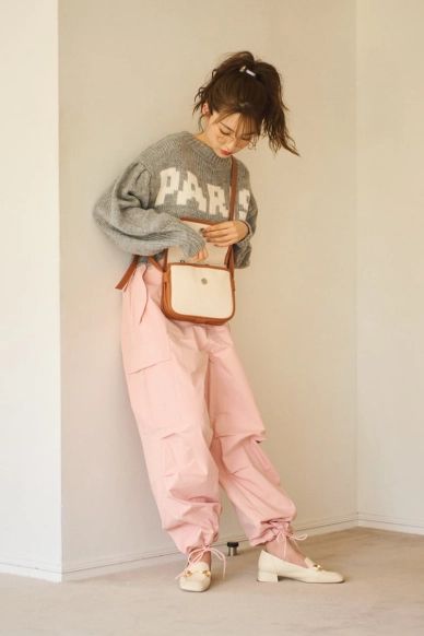 スポーティーなカーゴパンツを取り入れたコーデ。メンズライクなアイテムもピンクを選べばガーリーな印象に。ショート丈のニットをあわせれば、スタイルアップが叶います♡