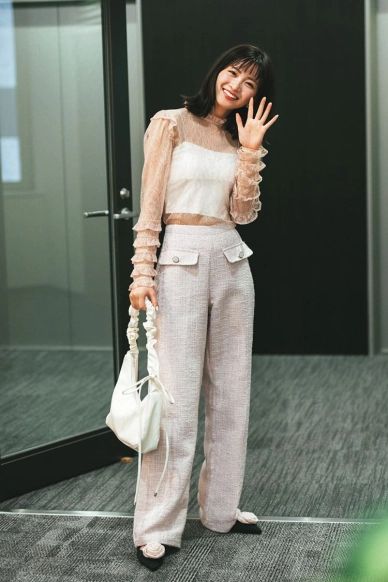 ガーリー要素の詰まったパンツコーデ。透け感のあるブラウスでさりげなく肌見せ♡ きちんと感も演出できるツイードパンツはパステルピンクでガーリに仕上げて!