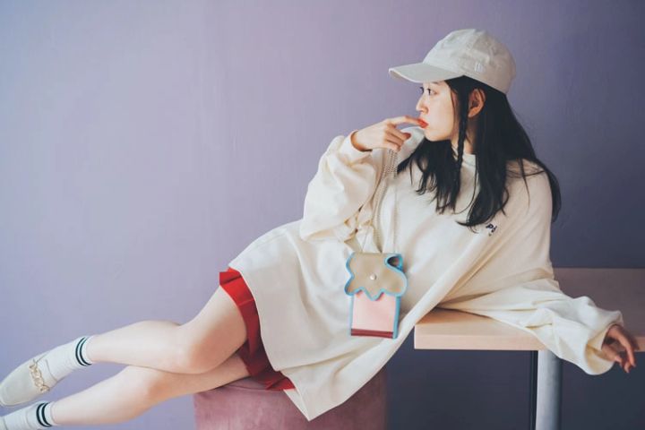 大きめのトップスにミニスカをあわせて細見えシルエットを演出。ちらっと見えるミニスカの赤色が、コーデのアクセントに。トップスと同系色の小物を選んで、統一感のあるコーデに仕上げて♡