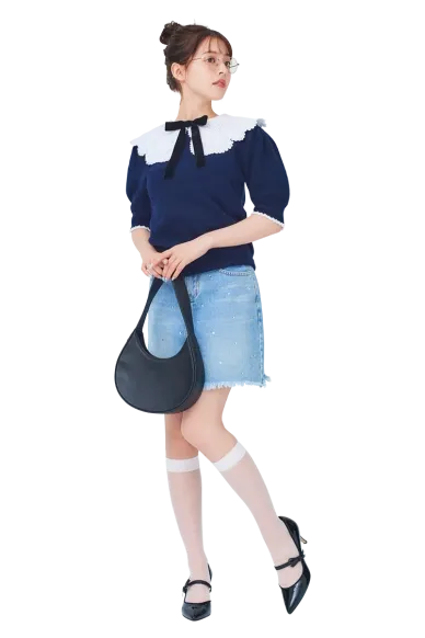 カジュアルになりがちなデニムミニスカも、落ち着いたネイビーのニットをあわせることで清楚な印象に。大きなえりやリボンで顔まわりを盛って。足元はハイソックス×パンプスでいいコちゃん見え♡