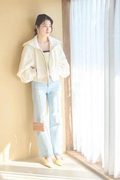 イエローのトップスやライトブルーのデニムが春らしいコーデ。 短丈のブルゾンはスタイルアップ効果抜群!デコルテを見せて女性らしさも忘れずに♡