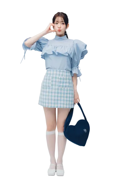 清潔感のあるライトブルーコーデ。華やかなフリルブラウスがきちんと感を演出してくれます。ツイードミニスカートでガーリー要素をプラス。足元は白で揃えて爽やかにまとめました。