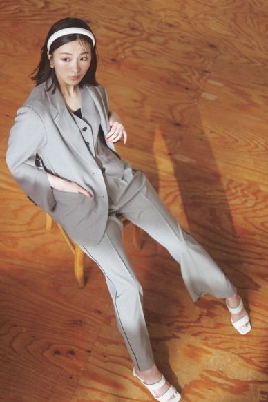 こなれた印象のスリーピースコーデ。きちんと見えする着こなしだからオフィスにも◎。小物は白で統一して、コーデをトーンアップ♡