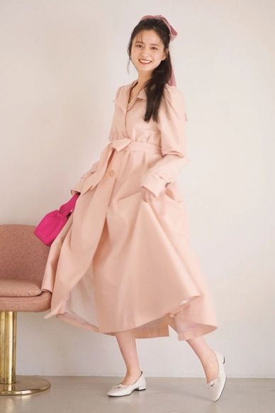 ピンクのトレンチコートが主役のコーデ。羽織るだけで春らしくガーリーな着こなしが叶う♡ ロング丈&フレアーデザインをチョイスすることでワンピースのような可愛らしいシルエットに!