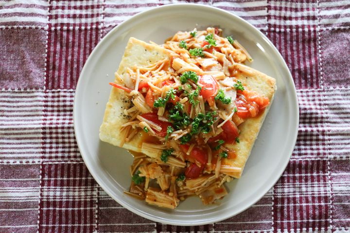 トマトベースのソースにはベーコンやえのきも入れますよ。