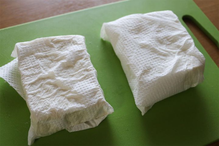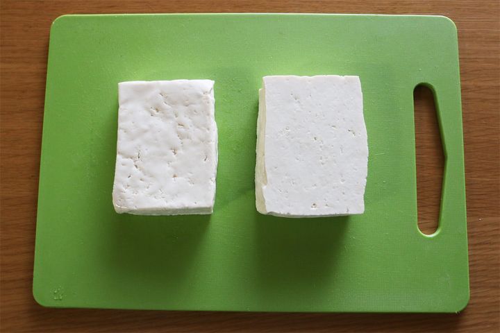 1.豆腐を半分の厚さに切ってペーパータオルで包み、ラップをせずに電子レンジ500Wで2分加熱する。