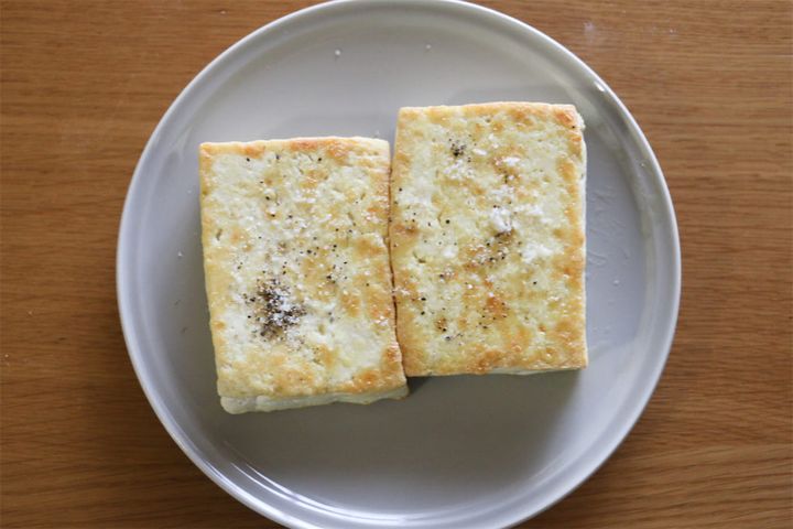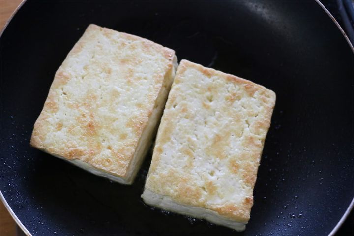 4.フライパンに半量のオリーブオイル(大さじ1)を熱し、3の豆腐を両面こんがり焼いて皿に取り、塩と黒こしょうをふる。