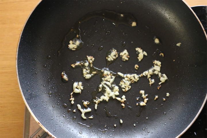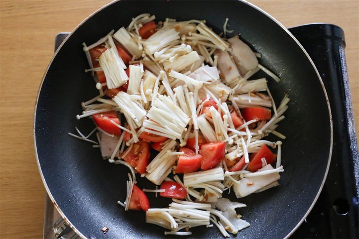 5.フライパンを拭き、残りのオリーブオイル(大さじ1)と2のにんにくを入れて熱し、香りが立ったらベーコン・えのきたけ・トマトを入れて炒め合わせ、しょうゆ・黒こしょうを加える。