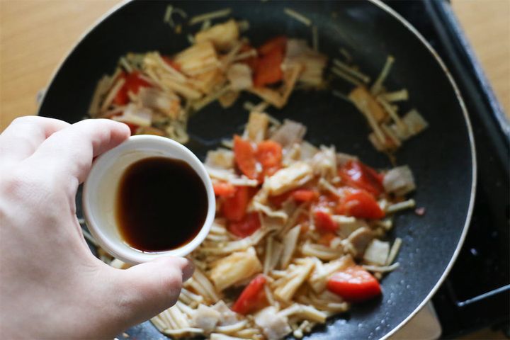 トマトの形が残るよう、炒めすぎないうちにしょうゆと塩、黒こしょうを投入!