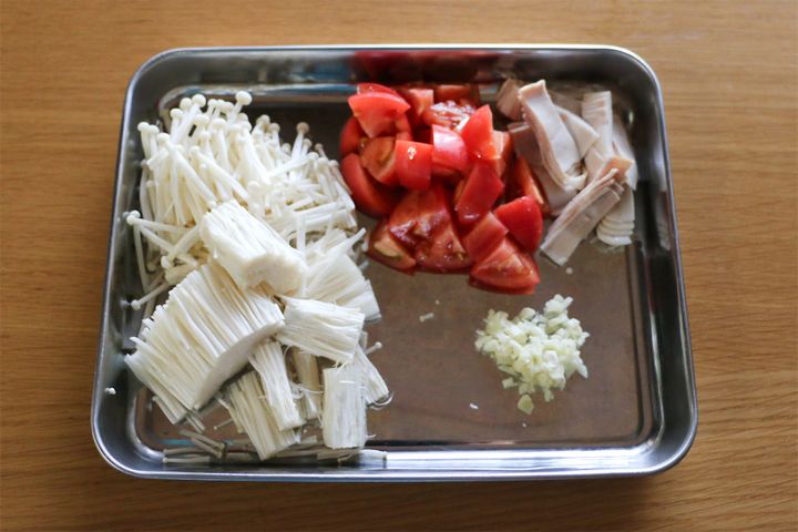 2. ベーコンは幅1cm、トマトはくし形に切り、半分に切る。えのきたけは2cm長さに切り、ほぐす。にんにくはみじん切りにする。