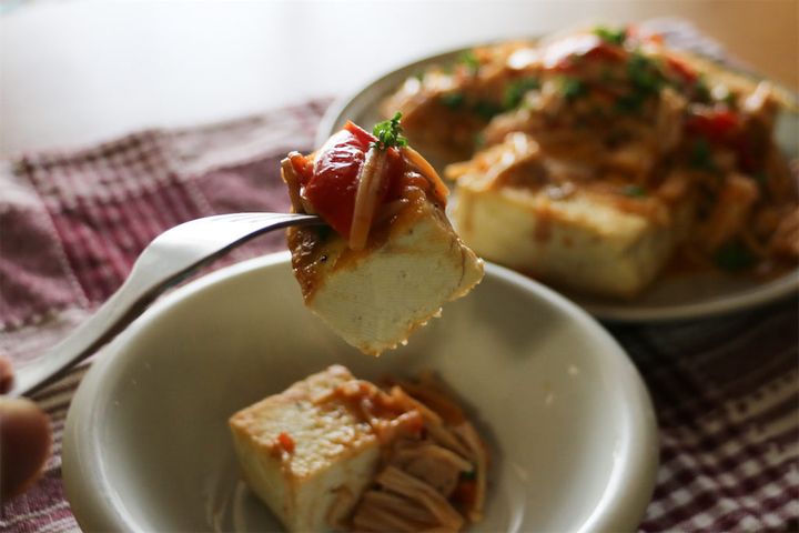 3. 焼き目が香ばしい「豆腐ステーキ」作ってみた!水は徹底的に切るべし!!トマトソースの旨味深〜い♡【農家直伝】