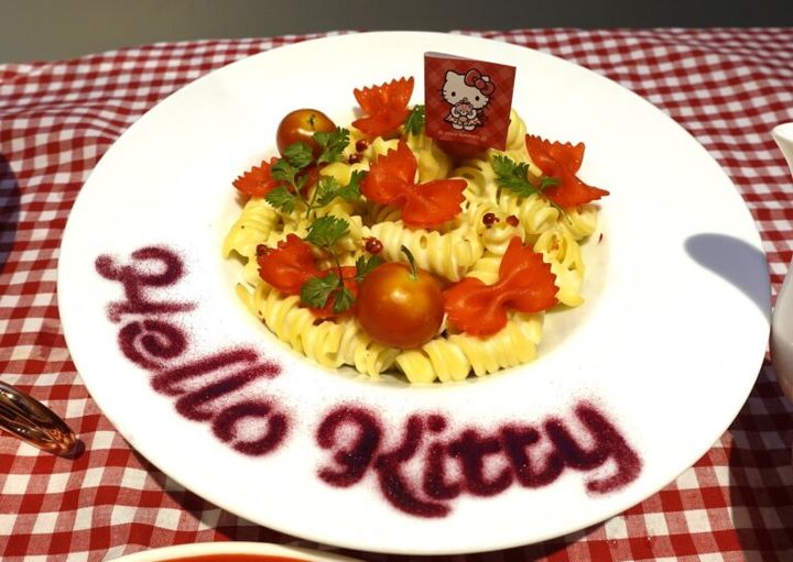 キティちゃんの赤いリボンをイメージしたガーリック風味のパスタに、りんごをイメージしたミニトマトがのったクリームパスタ。