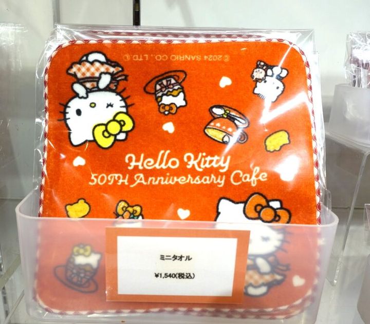 まずは、ウインクしたキティ&ミミィがかわいいミニタオル。「50th anniversary cafe」のロゴ入りのプレミア感も魅力。
