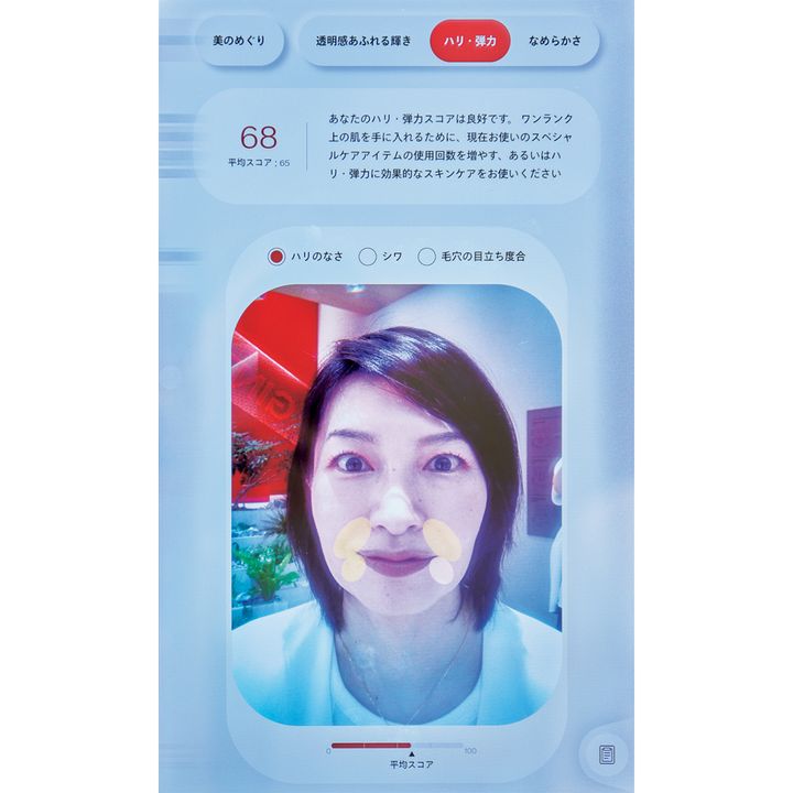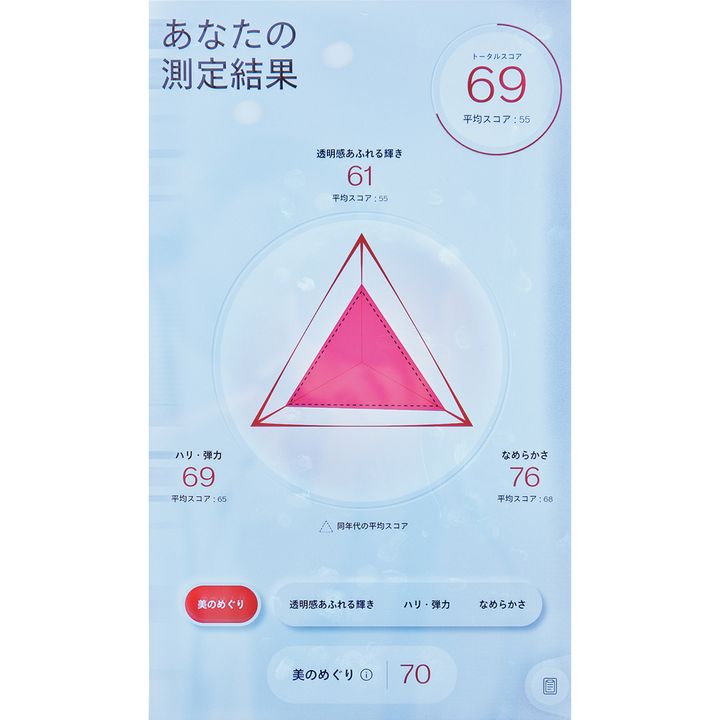 わずか30 秒で解析が終了し、現在の肌状態のスコアを算出。稲垣さんの結果は同年代の平均(黒線部分)より14点も高い69点!美肌の3大要素である透明感、肌のなめらかさ、ハリ・弾力のすべてで平均を上回り「とてもバランスが良い状態です」とコメントが。