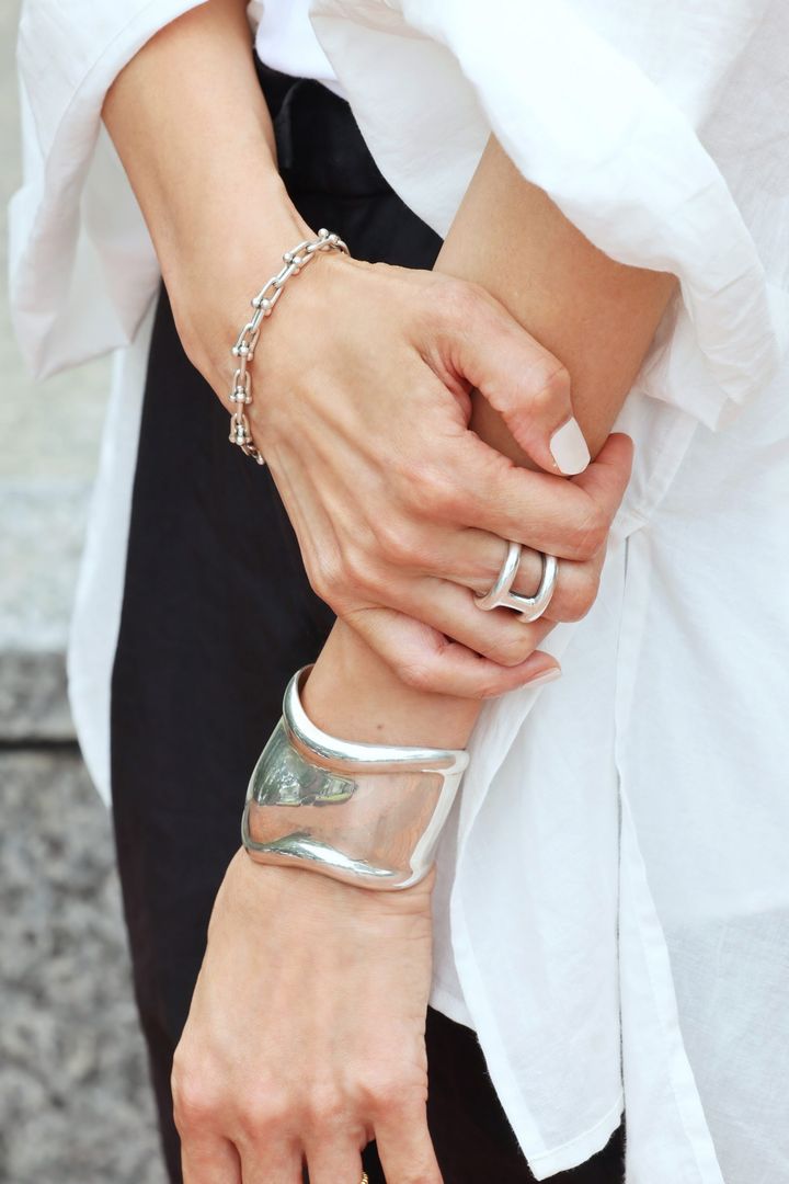 ring/HERMÈS bracelet/ともにTiffany & Co.(右手:ハードウェア 左手:エルサ・ペレッティ ボーンカフ)