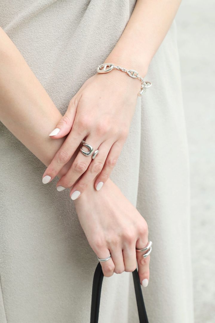 キレイめな印象の 「エルメスの指輪&ブレスレット」は 遊び心のある指輪と重ね付け