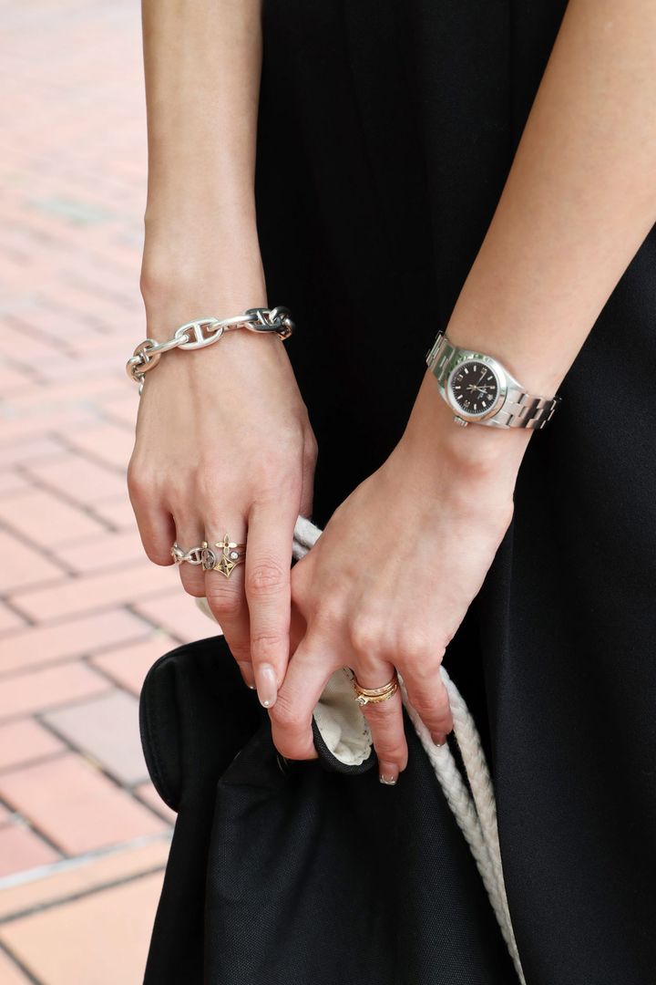 左手人差し指指輪 /HERMÈS 左手薬指上/母から譲り受けたもの 左手薬指下/LAZARE DIAMOND 時計/ROLEX