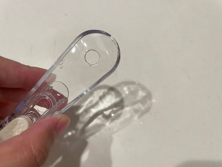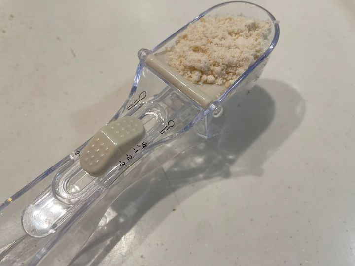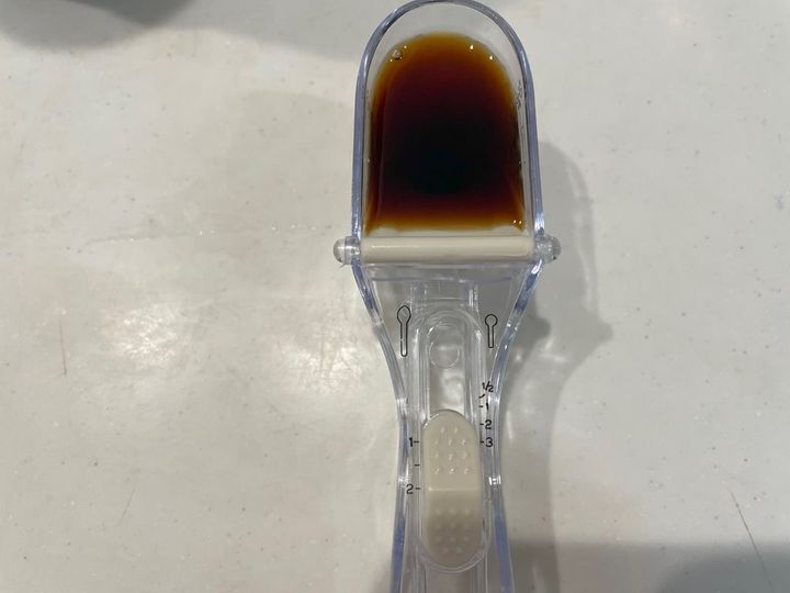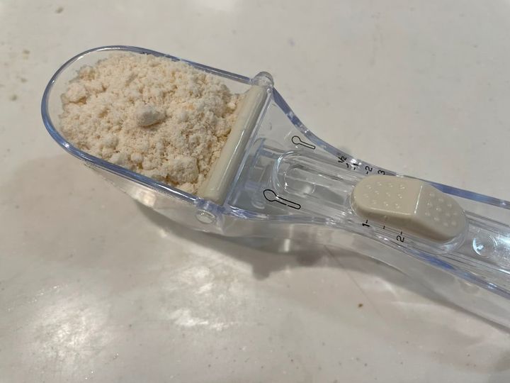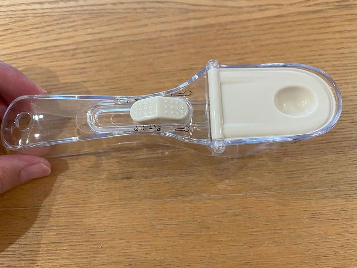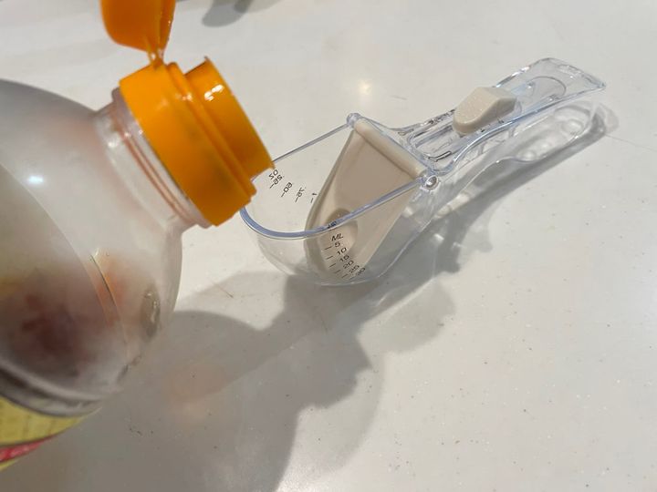 片手だとこぼしやすい大きめのボトルでも、スプーンが自立するので両手で注ぐことができるので、こぼさずに計量できましたよ♪