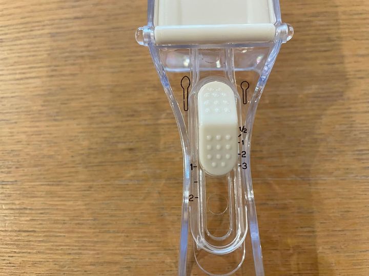 調節レバーを横から見ると、中心部分が山のように盛り上がっていて、そこに線があるので、その線を大さじや小さじの目盛に合わせます。