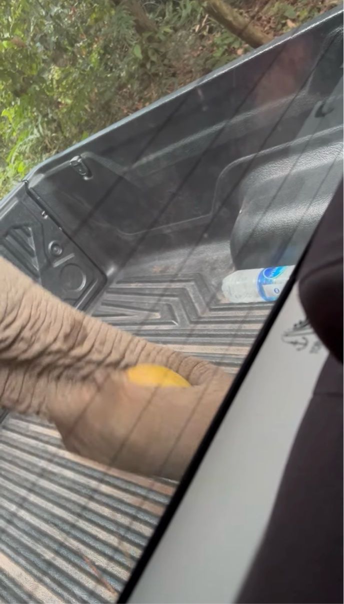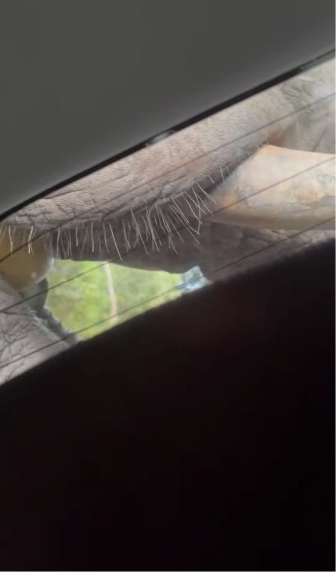 すぐ横をすっと通り過ぎる一瞬の出来事かと思われたその時、なぜかゾウが足を止めました。 この後、トラックの荷台を振り返った撮影者さんたちは驚愕の光景を目撃しました。