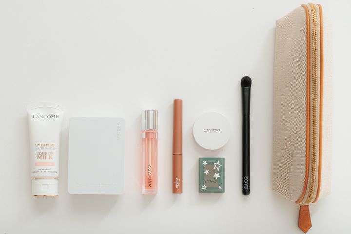 下地は血色もよく見せてくれるランコムの美人UV。biorのクッションやアムリターラのチークはオーガニック成分で肌に優しく長らく愛用しています。小田切ヒロさんのSOYO ブラシは使い心地が最高で、ポーチにもイン。フジコの眉マスカラは明るいカラーで顔に抜け感が出ます。