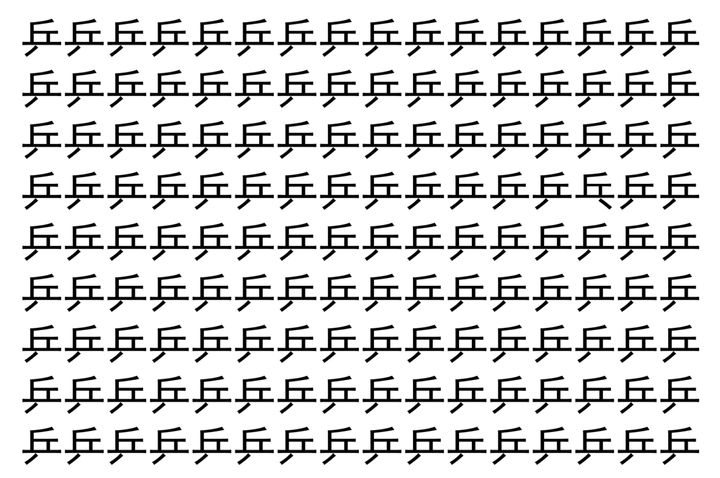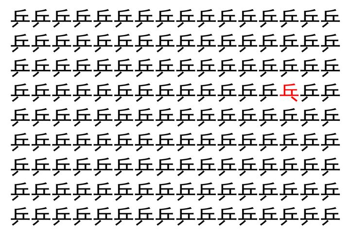 画像の中には、「乒」という漢字が縦に9行、横に16個並んでいます。 全部で144個となりますが・・・、そのうち1つは「異なる漢字」となってますよ!!