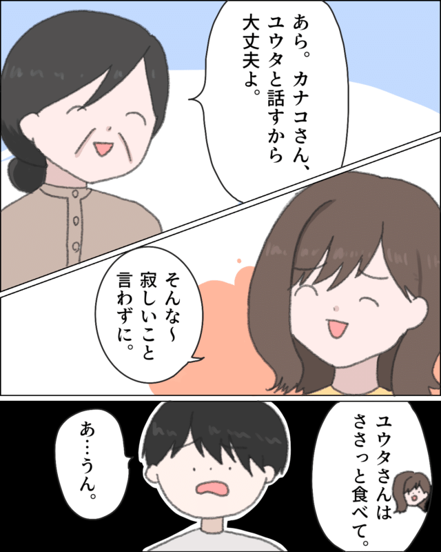 「あら。カナコさん、ユウタと話すから大丈夫よ。」と、義母も笑顔で対応してきました。「そんな~。寂しい事言わずに。」譲る気のないカナコさんは「ユウタさんはさっさと食べて。」と、義母はユウタさんに電話をかけてきたにもかかわらず、食事をするようにすすめました。