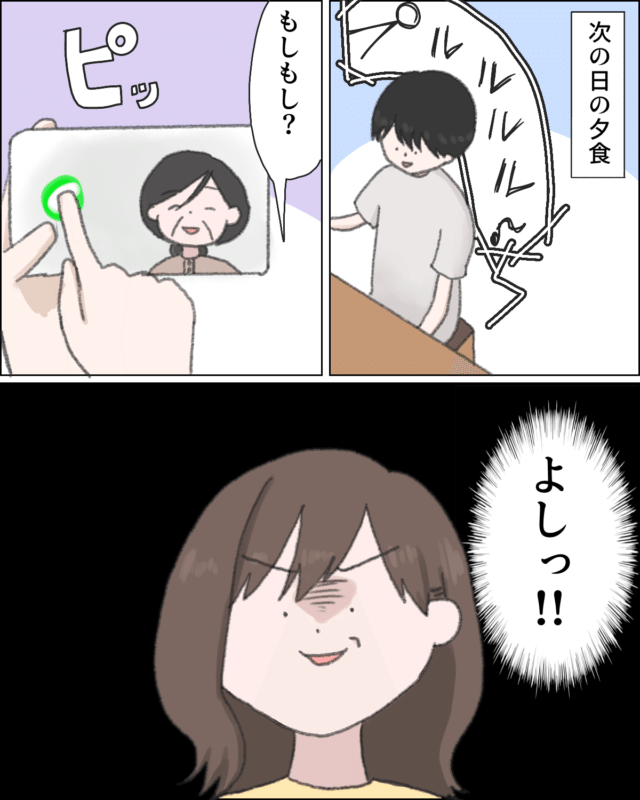 夕食時、いつものようにユウタさんが席に着いたタイミングで義母から電話がかかってきました。ユウタさんがテレビ電話モードにしてスマホをテーブルに置いた瞬間。