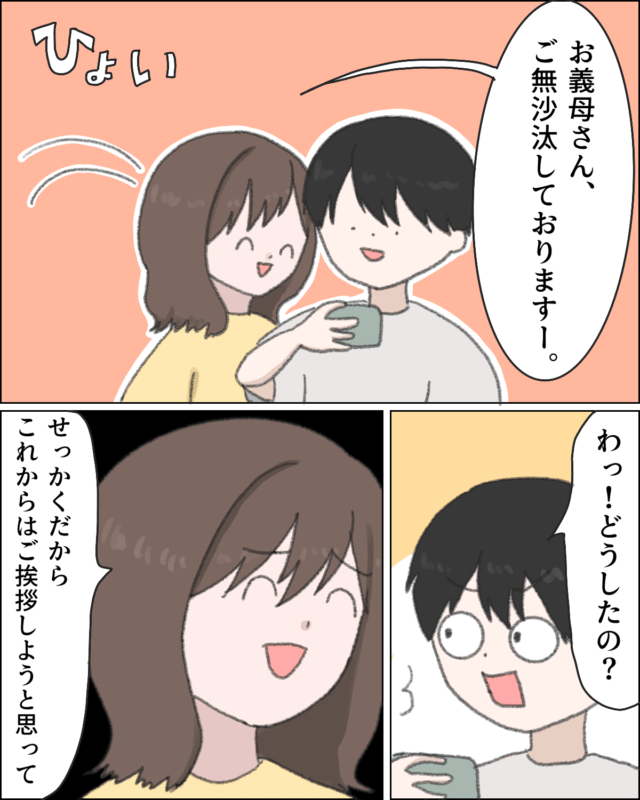満面の笑みでユウタさんのスマホ画面に登場したカナコさんは「お義母さん、ご無沙汰しておりますー。」と挨拶しながら割り込みました。